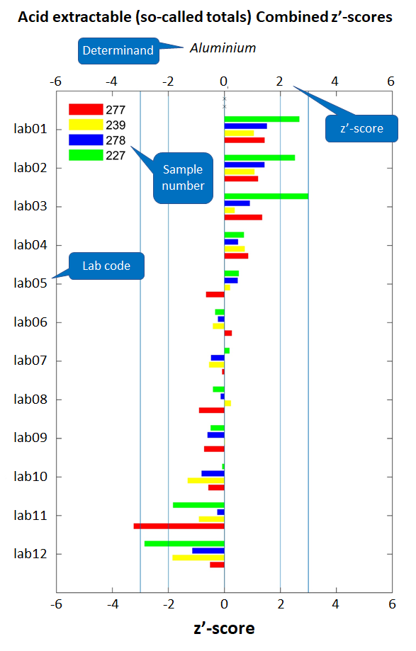 - z'-score plots based on consensus values per determinand/matrix combination using robust statistics showing the deviation from the reference value (see graph).